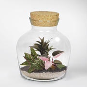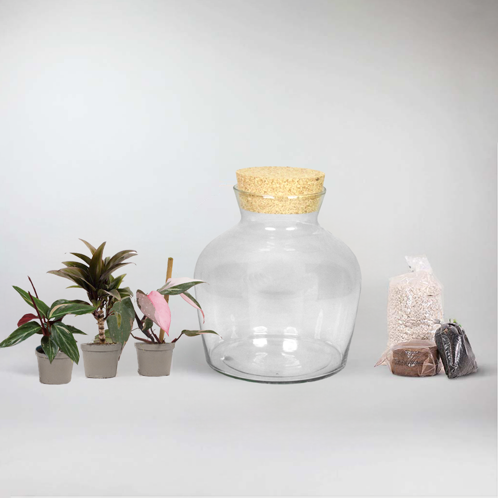 - Cada kit incluye un Bote de Vidrio & Tapa de Corcho, 3x Plantas Tropicales Rosas, Tierra, Grava y Carbón Activado.